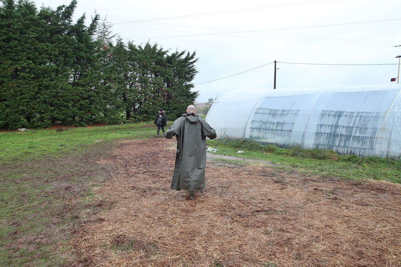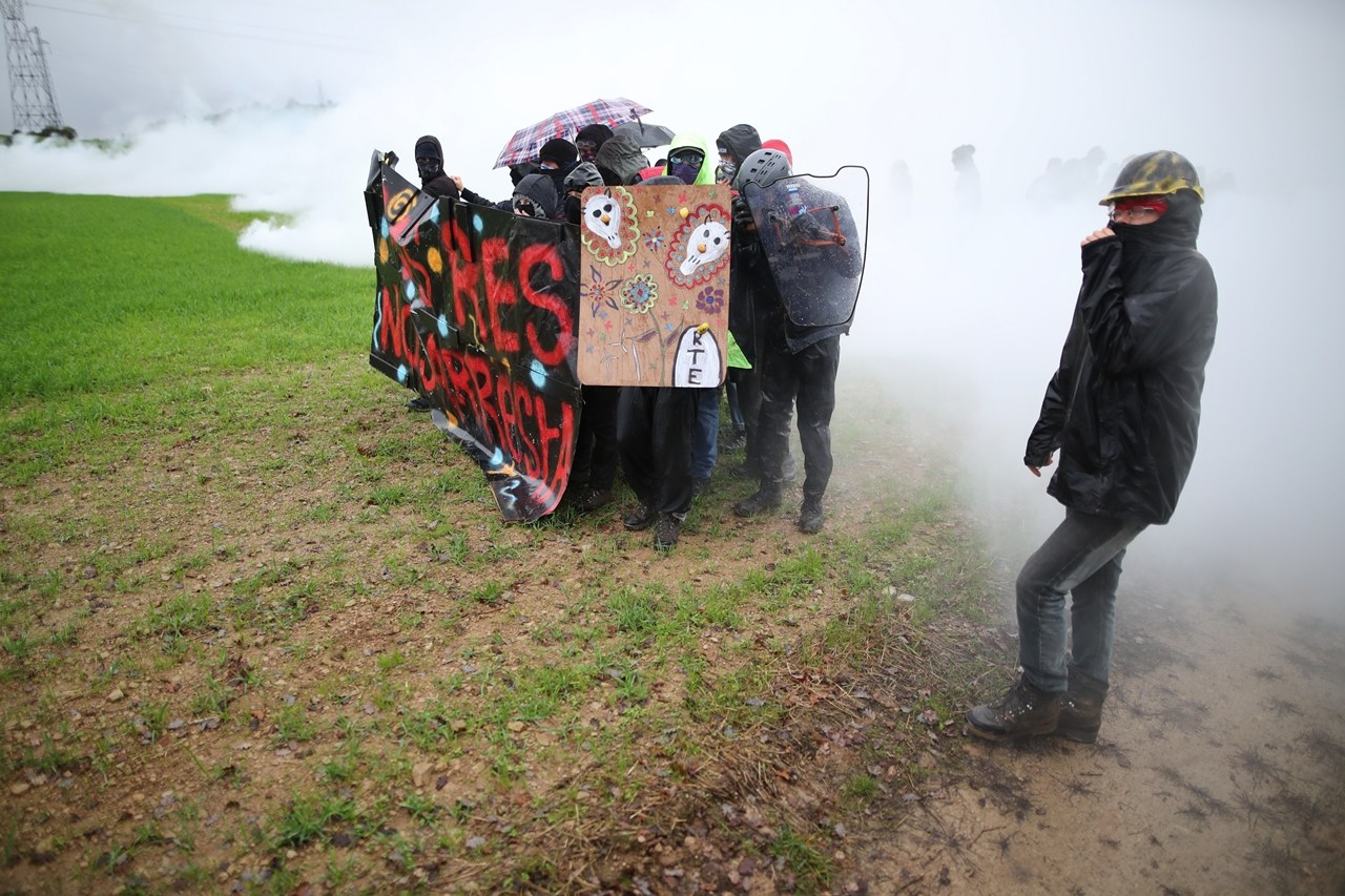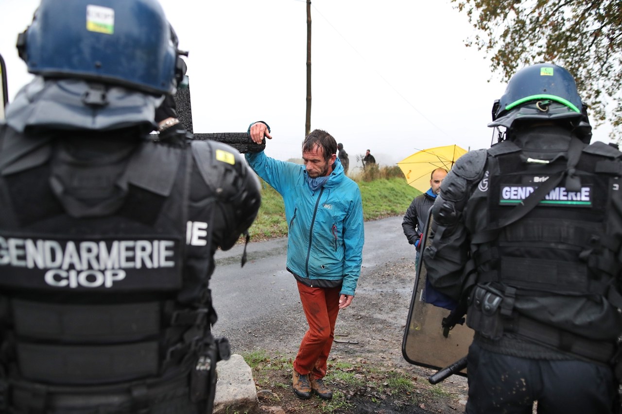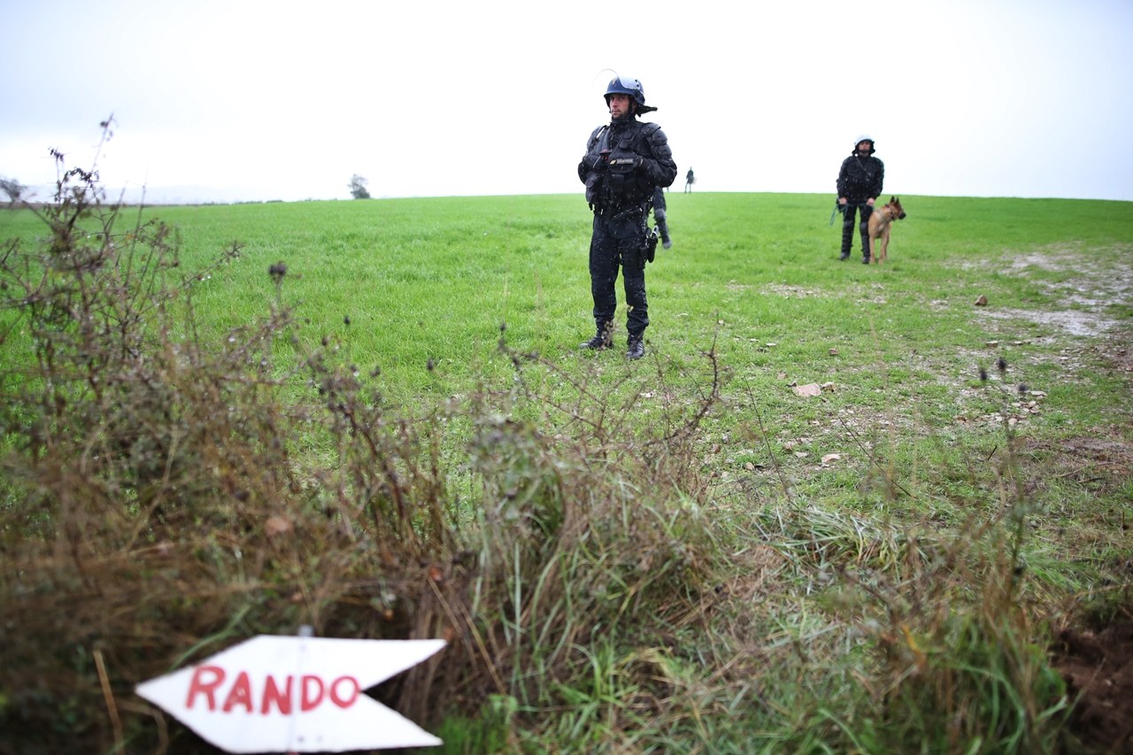 Trois semaines après cette évacuation prévisible, la motivation des Zadistes reste-t-elle indéfectible ? En ce jour de Toussaint, jour des cimetières, du marbre froid et des larmes chaudes, 200 jeunes hommes et jeunes femmes cagoulés et habillés de noir, quelques paysans visages découverts, quelques élus locaux, quelques vieux militants, certains assagis, d’autres insoumis se retrouvent chrysanthèmes sous le bras, au vieux stade de foot gorgé d’eau, banderoles boueuses et boucliers de fortune à l’épaule…Au sommet de la colline, en riposte, au pied d’une grue et d’un carré de pré ceinturé, cinquante gendarmes et gardes mobiles sont déployés, bottes au pied, chiens muselés. Dans un algeco, un officier surveille sur écran plat divisé en quatre, les mouvements à travers cette colline boueuse. Il n’entend pas les slogans habituels, flics impassibles, quelques jets de gaz lacrymo, les deux colonnes reculent, se désagrègent, émiettement. Elles se recomposent et reculent à nouveau dans un chemin ruisselant. Un classique du genre.